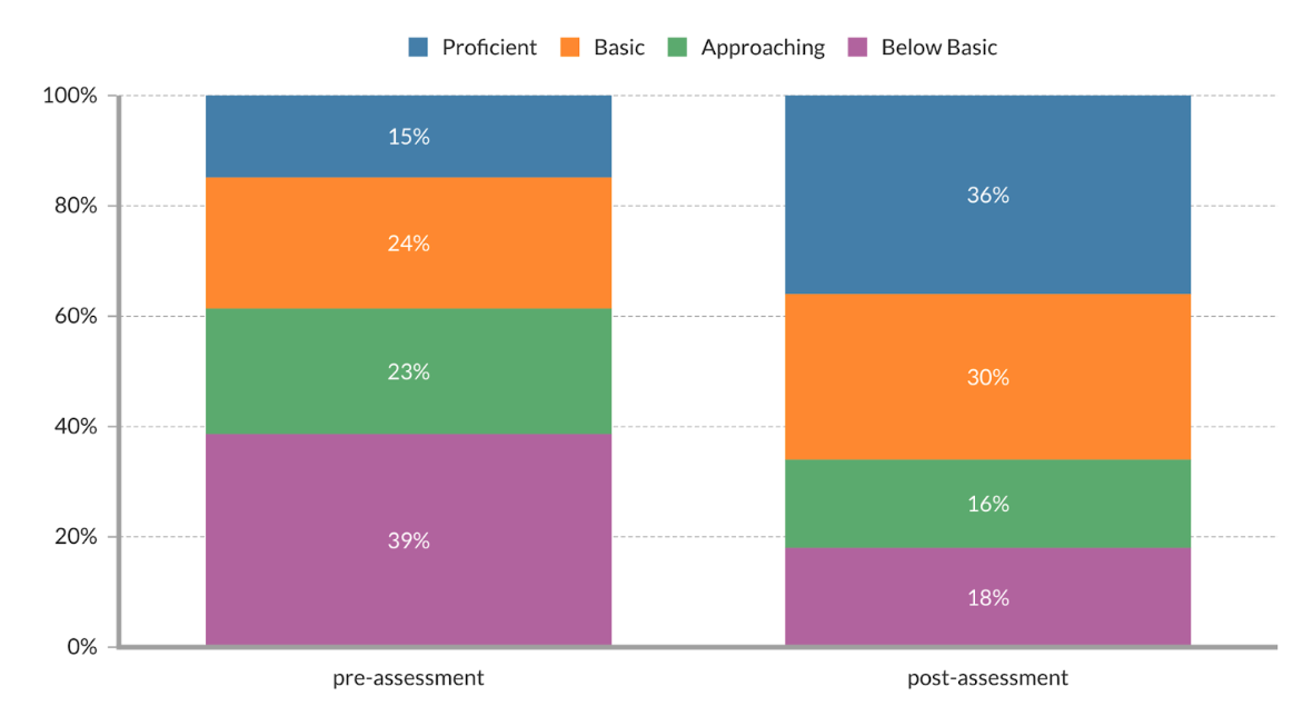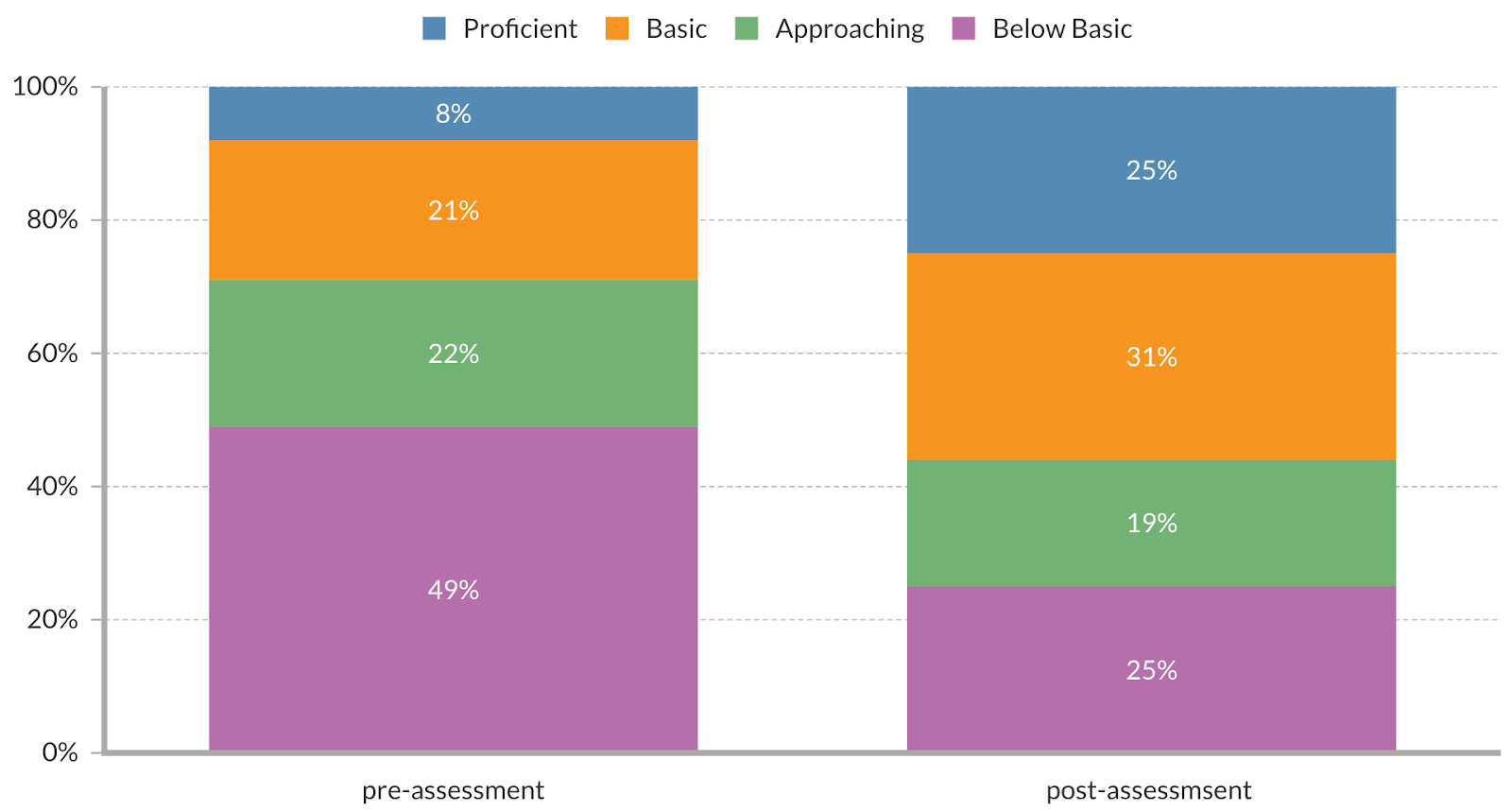 The percentage of students who tested ‘proficient’ in Math increased by 21 points, a 2x increase from the pre-assessments.